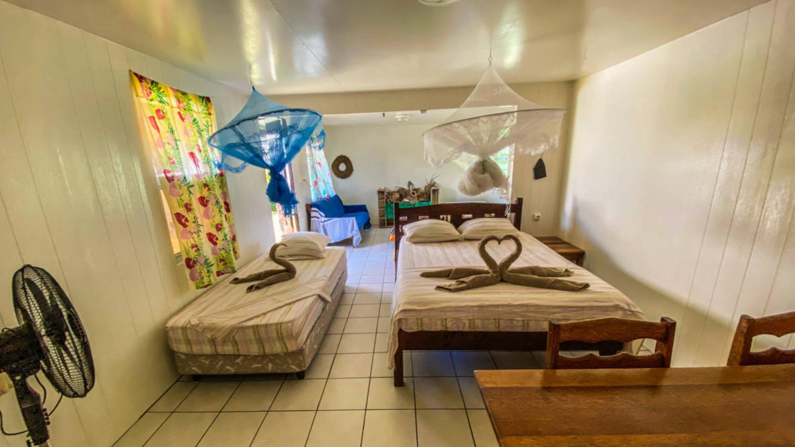 Spacious living area with a double bed + two single beds