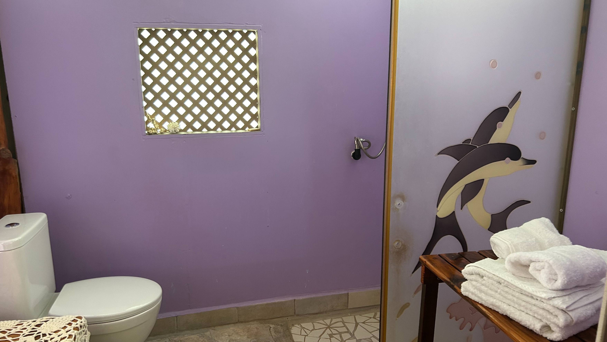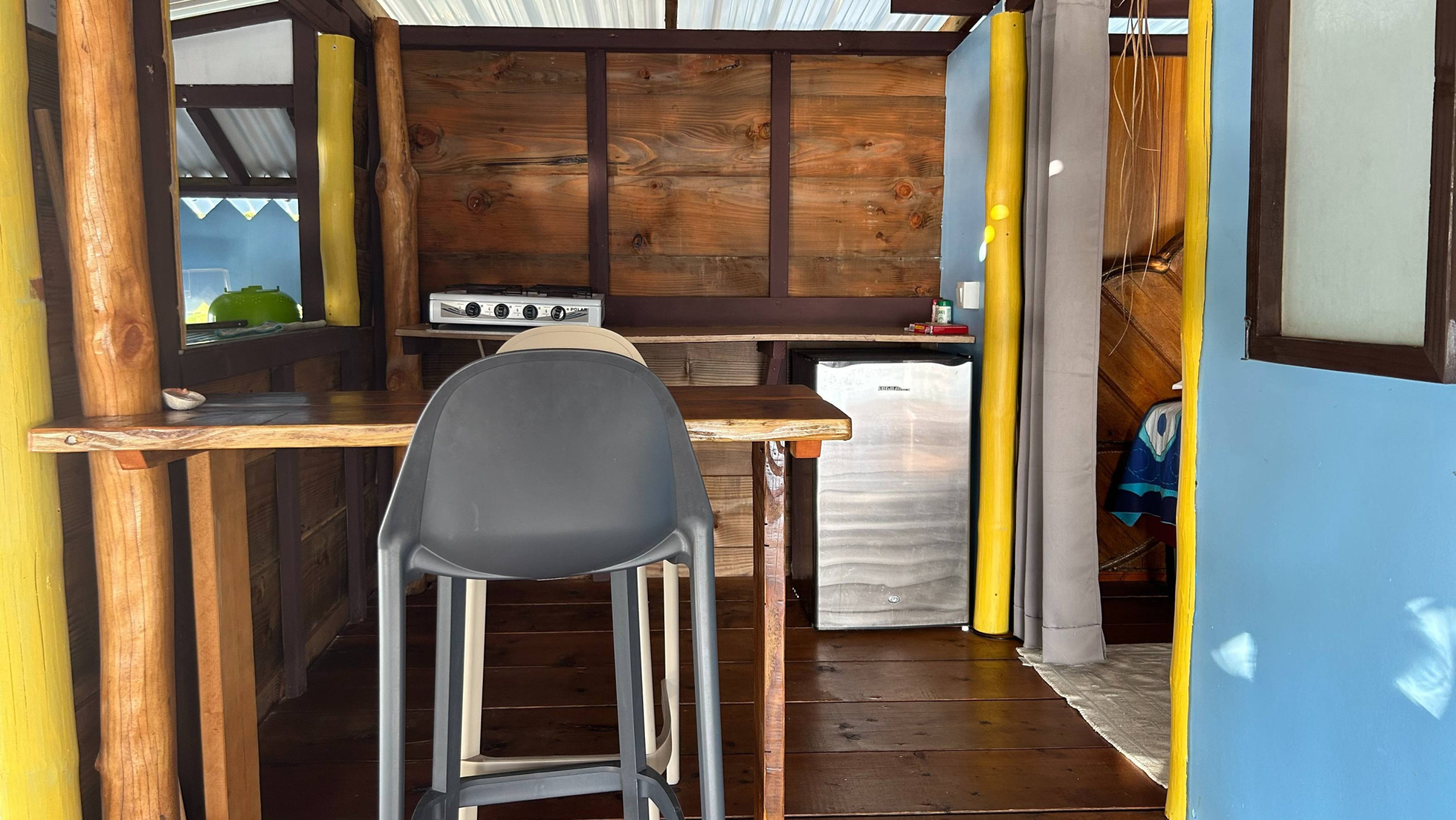 The kitchen is shared with another bungalow and features a terrace with a dining table, perfect for sharing your meals in a friendly atmosphere. The necessary items to prepare your breakfasts are included.